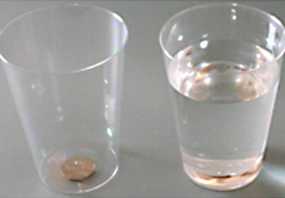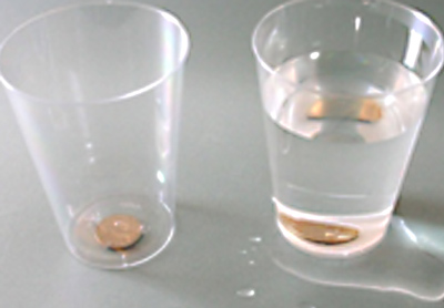 Gibt man nun Wasser auf eine der beiden Münzen und stellt den Becher wieder auf die Münze, ist sie aus allen Blickrichtungen gut zu sehen. Durch das Wasser wird der Luftraum unter dem Becher